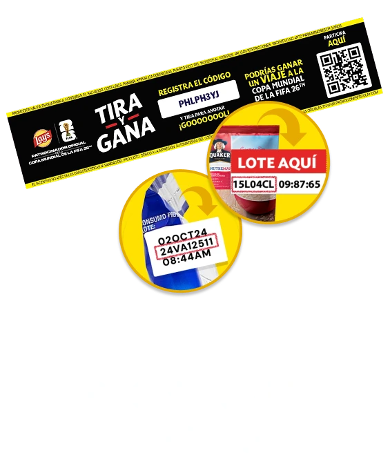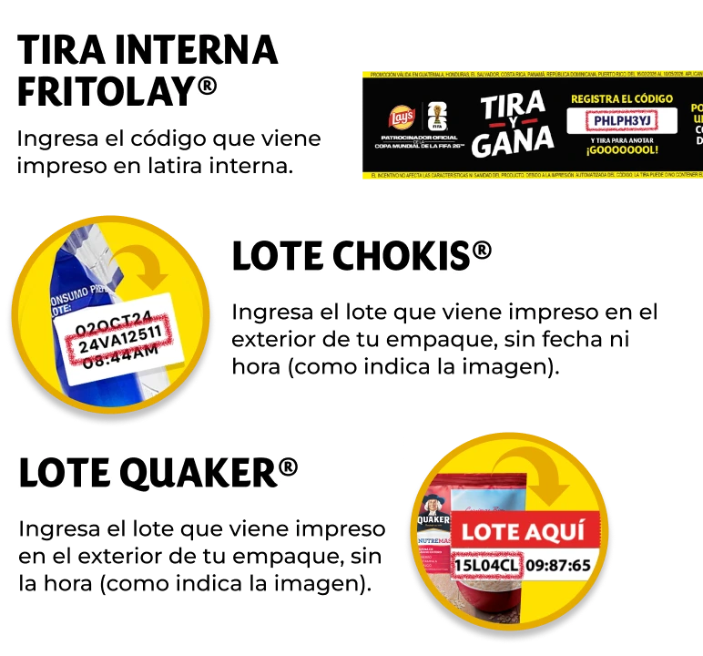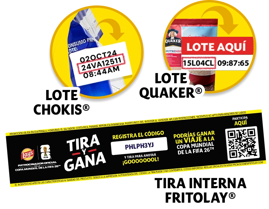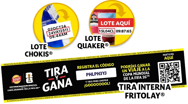Promoción válida en Guatemala, Honduras, El Salvador, Costa Rica, Panamá, República Dominicana y Puerto Rico del 16/02/2026 al 10/05/2026. Aplican restricciones. *Incentivo no apto para menores de 3 años. El incentivo no afecta las características ni sanidad del producto. Debido a la impresión automatizada del Código, la tira puede o no contener el Código impreso. Reglas oficiales en https://promocionesfritolay.com.